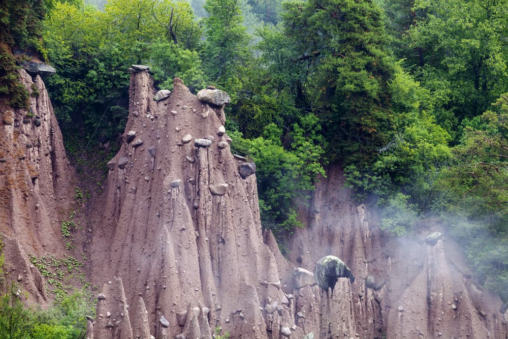 El curioso tamaño y forma de estas pirámides, son creadas por la erosión y se levantan de la tierra arcillosa. Cada una de ellas tiene una roca en la parte superior que protege el suelo. Las piedras tienen hasta 2 metros de diámetro y el suelo está conformado por restos glaciares. A causa de la erosión las piedras se lavan fuera de la tierra, pero la lluvia no logra afectar a estas pirámides que empiezan a crecer.