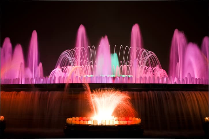 2. La Fuente Mágica de Montjuic, en Barcelona (España). El espectáculo de color, luces movimiento, música y aguas acrobáticas que puedes ver aquí es espectacular. Esta fuente atrae a miles de turistas cada noche.