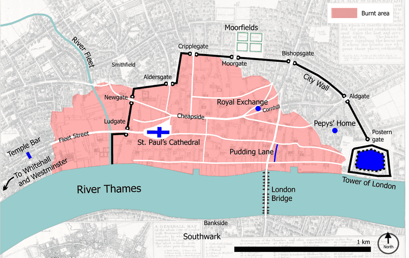 El Gran Incendio comenzó en la panadería de Thomas Farriner en la calle «Pudding Lane» (en español Calle del Budín) que es el area actualmente conocida como la Square Mile (en español La Milla Cuadrada). Rápidamente, el incendio se expandió hacia el oeste alcanzando gran parte de la ciudad de Londres y llegando a temperaturas de 1250 ºC.