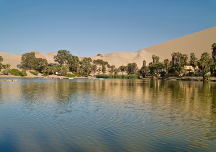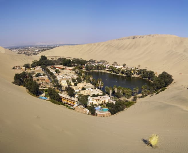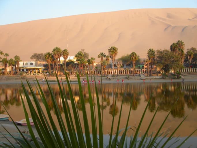 La costa peruana es uno de los lugares más desérticos de todo el mundo. Cerca de una ciudad llamada Ica, se encuentra Huacachina, un oasis en el desierto del Perú. Este lugar cuenta con la curiosidad de hallarse rodeado de dunas de arena por kilómetros y kilómetros, y es simplemente un oasis con un pueblito anexado a él, que se ha vuelto realmente turístico y atrae a miles de visitantes todos los años