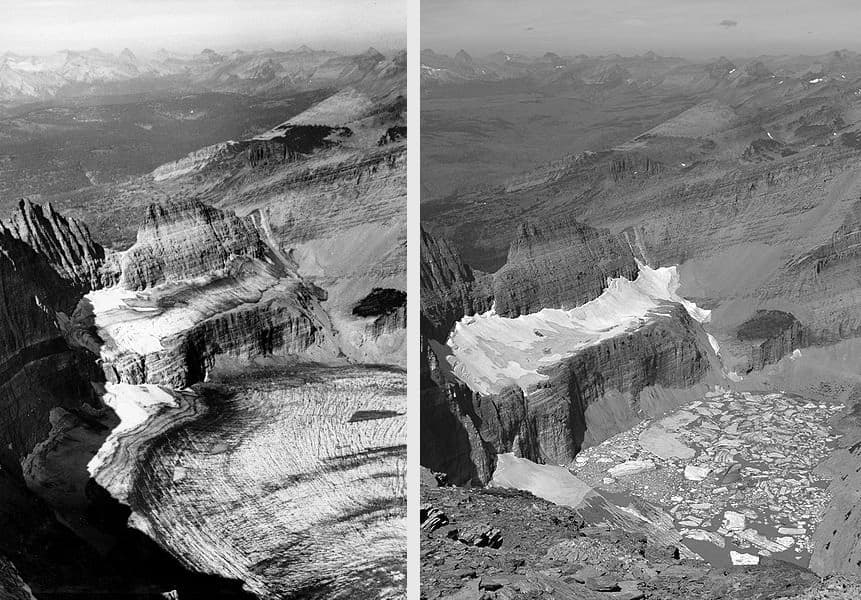 En esta imagen pueden ver el glaciar Grinell del Monte Gould y apreciar como ha ido disminuyendo de tamaño con el paso de las décadas.