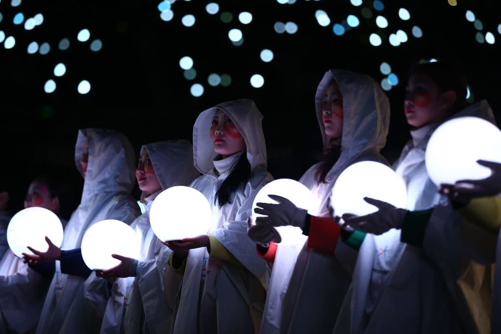 Unos 400 voluntarios cargaron bolas de LED y una cascada de luz 'extinguió' la flama olímpica. Los bailarines se juntaron en forma de un copo de nieve para hacer este efecto.
