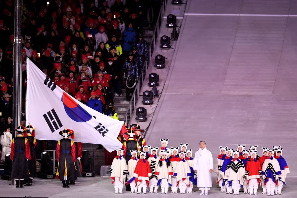 La bandera de la unificación coreana no se vio en la ceremonia. Corea del Sur mostró su propia bandera, así como Corea del Norte. El patinador Lee Seung-hoon cargó la de Corea del Sur y la pareja de patinaje Kim Ju-sik la de Corea del Norte.