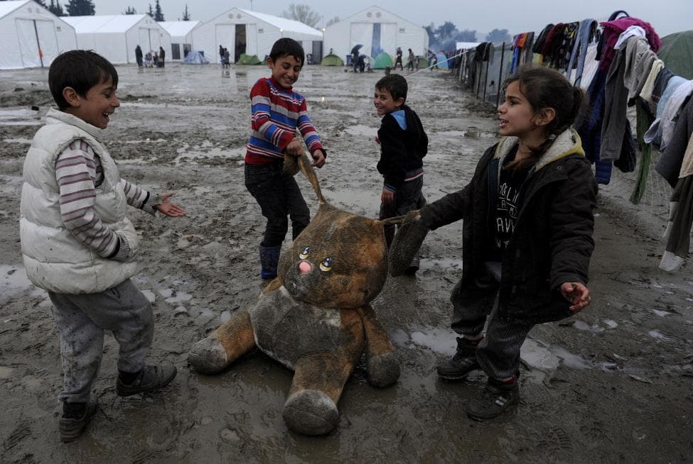Estos niños están jugando con su peluche en medio de un improvisado campamento de refugiados.