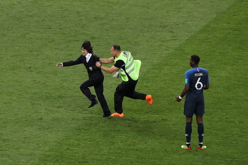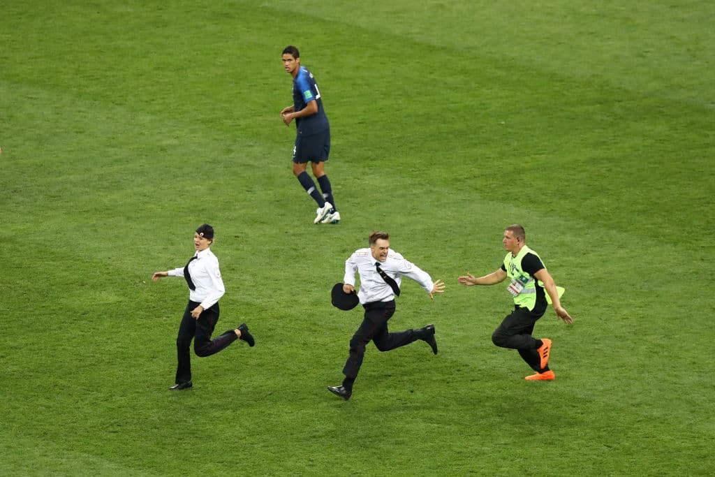 Cuando la pelota ya giraba por el césped durante el segundo tiempo de la final de Rusia 2018, 4 espectadores entraron al campo de juego vestidos de policías. Si bien las cámaras intentaron no enfocar el suceso, el mundo entero se percató de que varias personas ingresaron y corrieron por todo el césped.