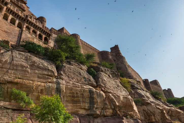 La Ciudad Azul es vigilada por la inmensa fortaleza medieval de Mehrangarh, ubicada sobre la cima del Monte de las Aves. Cuenta la leyenda que un hombre alguna vez vivió allí en el monte y fue obligado a retirarse en el momento en que comenzó a construirse la fortaleza. Como venganza, el hombre lanzó una maldición sobre la estructura: prometió que esta árida zona del planeta no tendría agua. Casualmente, Jodhpur sufre alrededor de 2 o 3 sequías importantes por año.