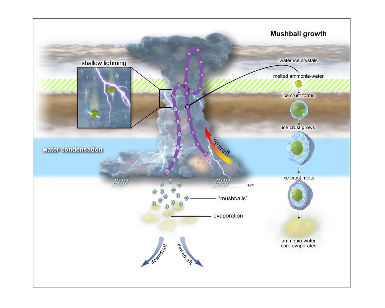 Para explicarlo, los investigadores desarrollaron un modelo de mezcla atmosférica en el que simulan la presencia de tormentas eléctricas. Allí muestran cómo la mezcla de agua y amoniaco secan la atmósfera profunda, absorbiendo gran parte del amoniaco.