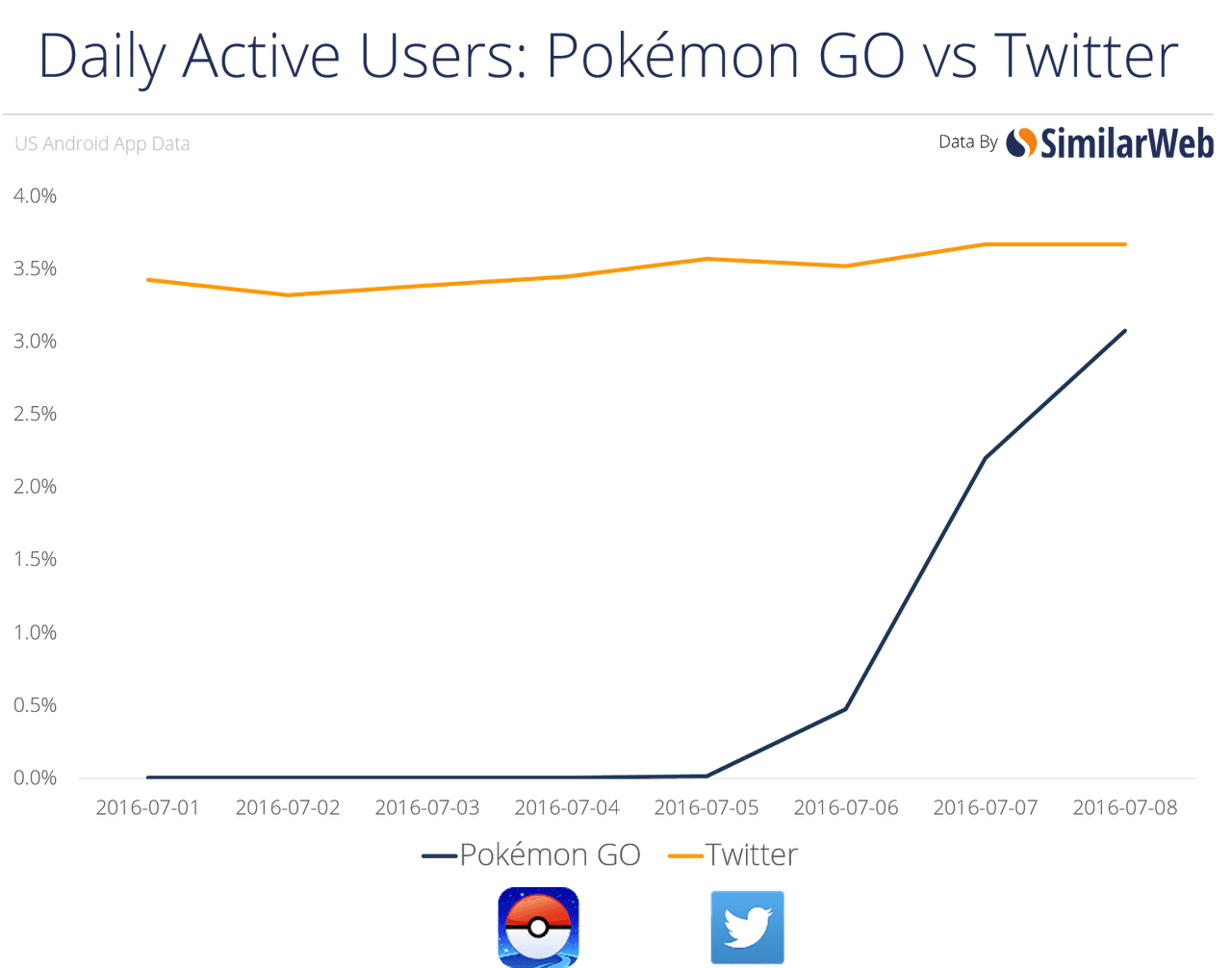 Tanto ha sido el impacto del videojuego de realidad aumentada que según las estadísticas publicadas en SimilarWeb, es muy probable que Pokémon Go sobrepase a Twitter en usuarios activos y esto sin contar que aun el juego no ha sido lanzado a nivel global y que estas estadísticas solo representan a los dispositivos Android, dejando fuera un mercado tan inmenso como el de iOS.
