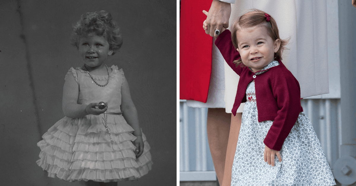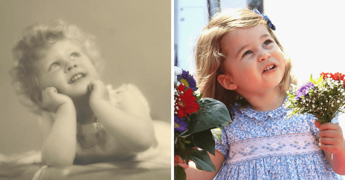 Mientras que su hermano mayor, el príncipe George, luce un cabello rubio, Charlotte lo tiene castaño claro al igual que la Reina Elizabeth antes de que el suyo se volviera totalmente blanco. Además tienen el mismo perfil, tanto bisabuela como bisnieta tienen una pícara sonrisa.