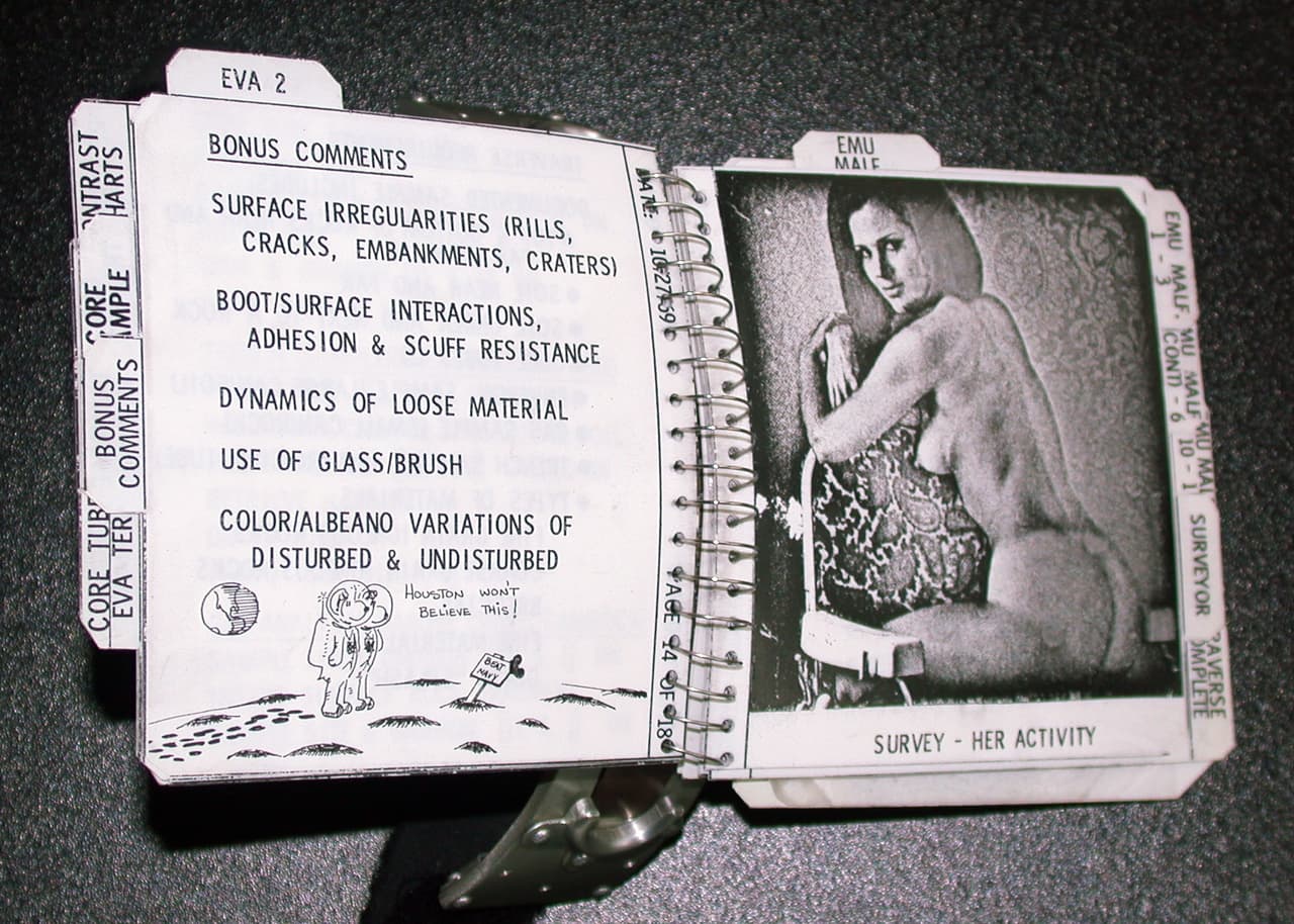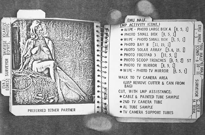 Pero este tipo de anécdotas no fueron las únicas, sino que una de las más curiosas es que Conrad y Bean llevaban fotos de Playboy en las muñecas. Las horas disponibles para analizar el lugar no eran muchas, así que cada uno llevaba una lista de tareas atada en el brazo. Allí fue donde Dave Scott, el comandante suplente del Apolo 12, colocó las fotografías junto con algunas caricaturas de Ernie Reyes sin que nadie lo notara.