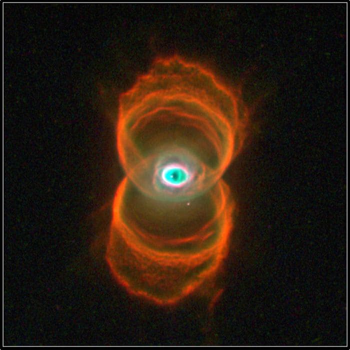 En esta fase, una estrella vierte la mayor parte de sus capas externas y eventualmente deja atrás un núcleo caliente. Tiempo después, ese núcleo se contrae para formar una densa estrella de la categoría enana-blanca.