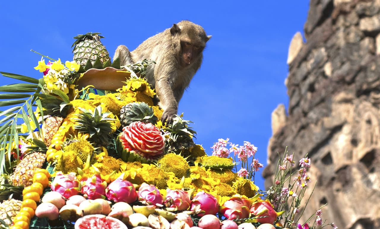 En noviembre, la mayoría de tailandeses depositan frutas, verduras y demás alimentos en grandes espacios de la provincia de Lopburi, no lejos de Bangkok, esperando a que los más de 2 mil monos locales desciendan para darse un festín. Así es este Buffet de Monos, cuyo ausente simbolismo histórico o espiritual se desvanece en pos de un evento cuyo único objetivo es el de atraer al turista.