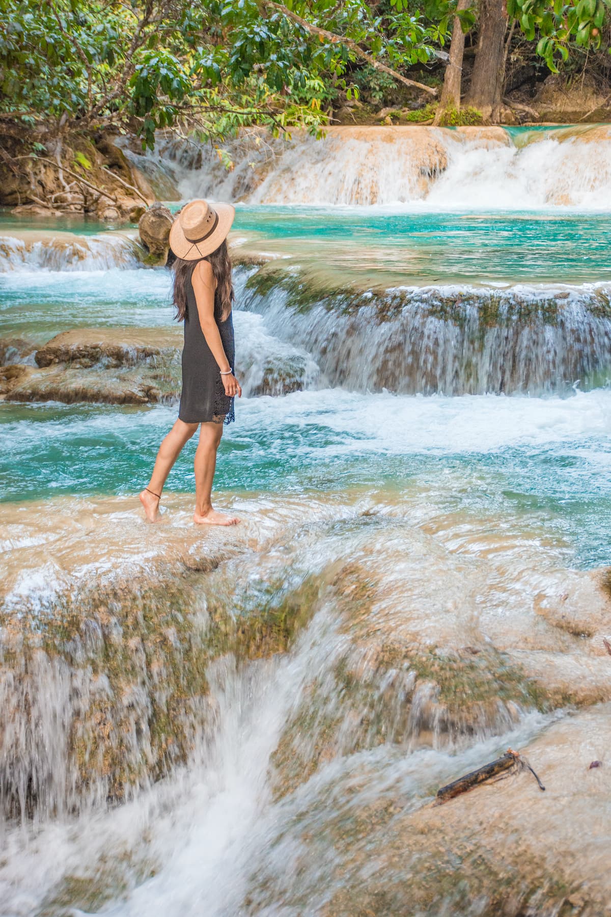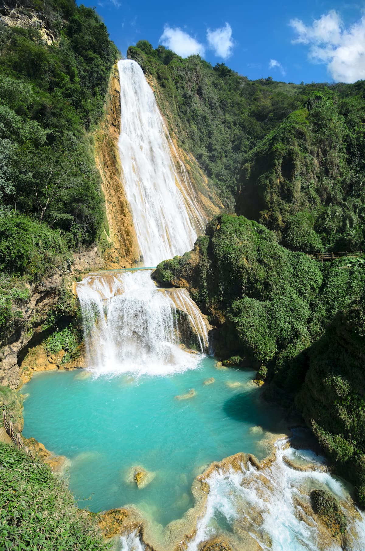 El grupo de cascadas forman grandes albercas de color turquesa, que combinan con el verde de la vegetación que rodea a este espectáculo natural. ¡Es un destino imperdible!