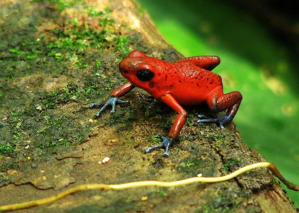 Una estrategia de reproducción similar es la de la bella ranita Oophaga pumilio, que pone sus huevos en las axilas de las bromelias, unas plantas muy comunes en el trópico y que tienen la capacidad de almacenar agua entre sus hojas. Cuando nacen las larvas, la hembra los traslada en su espalda a diferentes sitios separados, para así facilitar su supervivencia. Luego, con regularidad, los visitará y depositará huevos infértiles que serán su único alimento hasta que completen la metamorfosis. Veamos que sucede con la rana bermeja, la última de nuestros anuros.