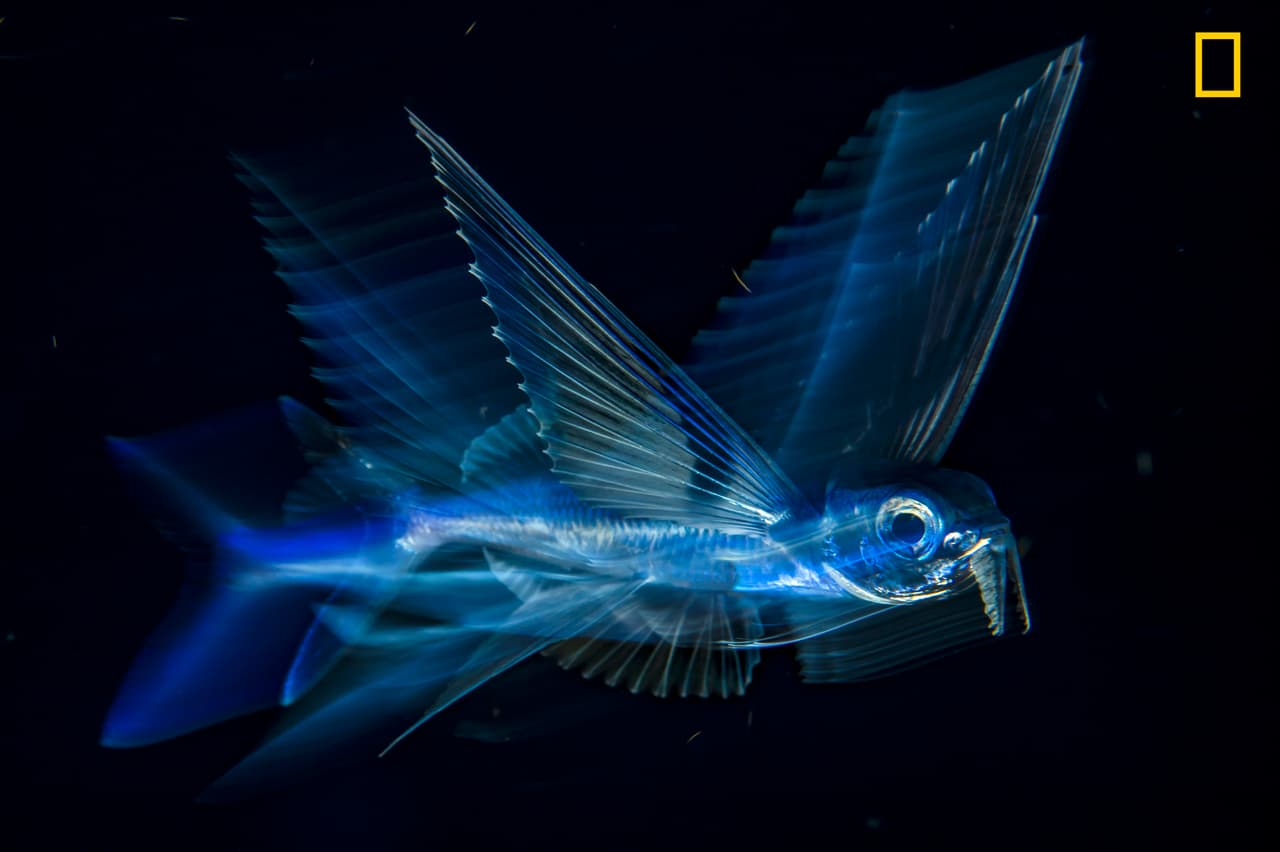 Un pez volador atraviesa el agua oscura a cinco millas de Palm Beach, Florida.