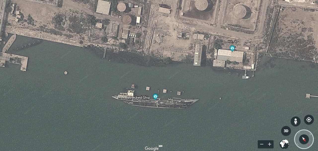 Al suroeste de Asia, en el Río Shatt al-Arab, Google Earth localizó este barco que se encuentra completamente hundido. Se desconocen las condiciones del incidente.