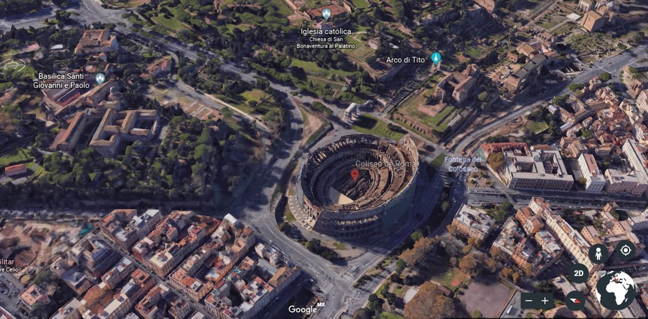 Esta espectacular postal nos es regalada por Google Earth y el paisaje de Roma, en donde destaca el Coliseo. Es una vista maravillosa que casi simula una pintura.