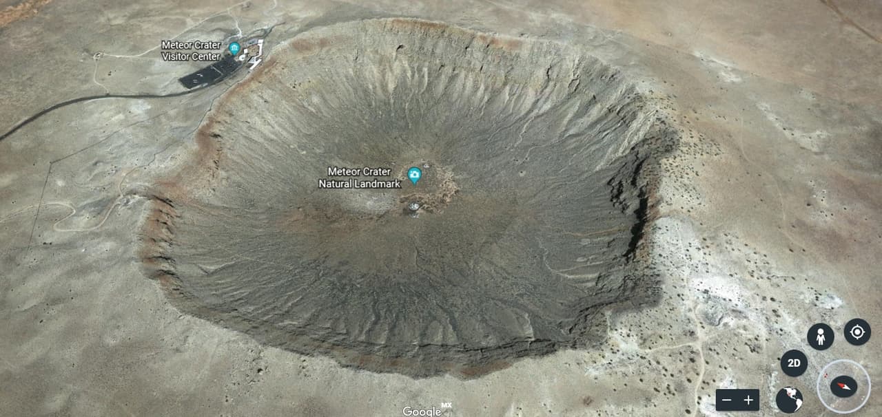 Esto que ves aquí es el Cráter Barringer. Es la consecuencia que dejó el impacto de un meteorito nombrado Canyon Diablo, el cual cayó hace 50,000 años en una localidad de Arizona llamada Flagstaff.