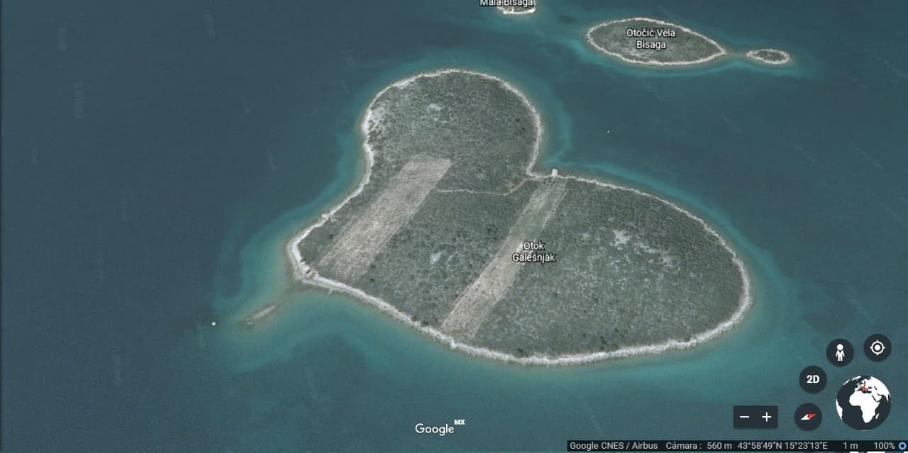 En Google Earth también puede encontrarse esta asombrosa isla en forma de corazón. El lugar recibe el nombre de Galesnjak y pertenece a Croacia.