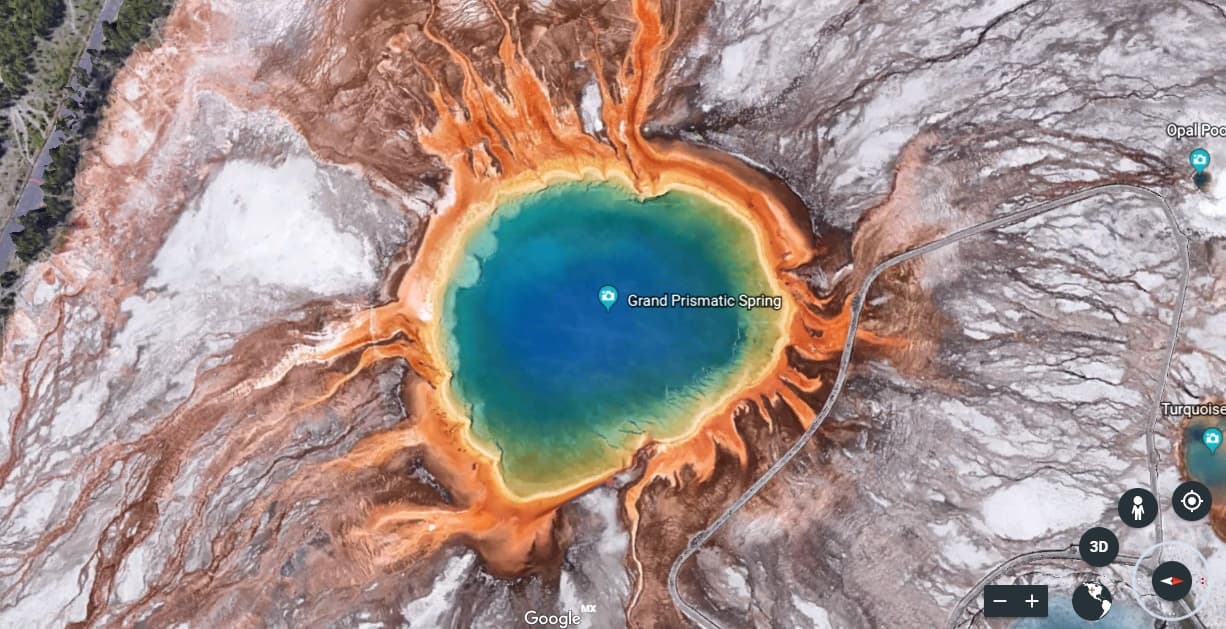 Este fenómeno natural es el Grand Prismatic Spring y está ubicado en el parque Yellowstone, en Estados Unidos. Es la mayor fuente de aguas termales del país.