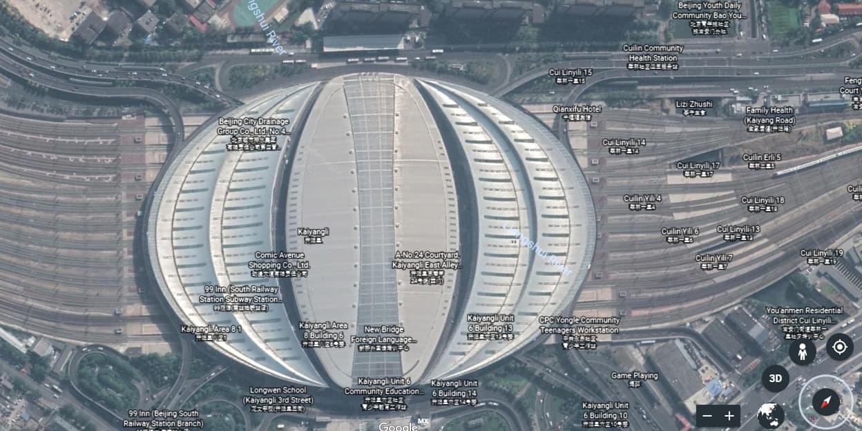La central del Ferrocarril en Beijing, China, es la más impresionante y moderna a nivel mundial. Vista desde el satélite de Google, simula un ojo de gato.