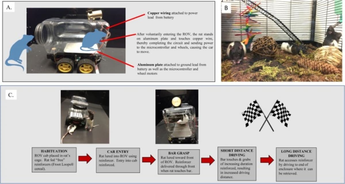 Un total de 14 ratas (6 hembras y 11 machos) fueron entrenadas para conducir en pistas de 4 metros cuadrados. Cuando la rata tocaba la barra del volante y conducían hacia adelante, se le recompensaba con un poco de cereal.