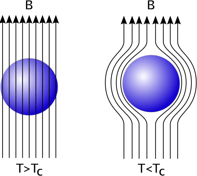 Sin embargo, cuando el objeto es un superconductor, éste repele los campos magnéticos y hace que éstos sean “empujados” hacia los lados, “atrapando” al objeto en el aire entre los campos magnéticos, haciendo que el objeto flote en relación a algún objeto que genere el campo magnético.
