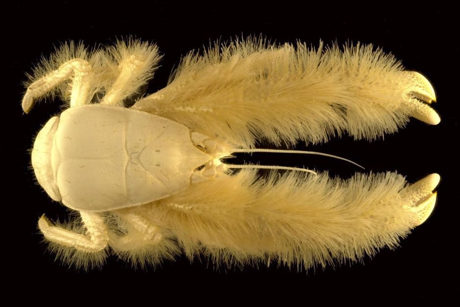 El popularmente conocido como cangrejo yeti ( Kiwa hirsuta) habita las oscuras y profundas aguas del Pacífico sur. Precisamente se encontró a esta especie a 2228 metros de profundidad, a varios kilómetros al sur de la Isla de Pascua. Se trata de un crustáceo decápodo que carece de ojos y de carácter omnívoro. Vive rodeando fuentes hidrotermales para sobrevivir. El verdadero propósito de esos grandes y llamativos filamentos en sus extremidades aún no se ha logrado determinar, aunque se supone que deben de ayudarle a capturar su alimento.