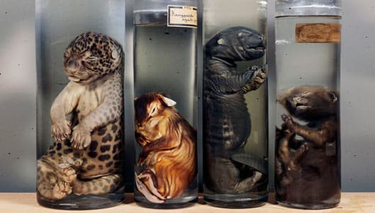 En un principio era una colección de anatomía para estudiantes de veterinaria. Hasta ahí todo es normal, excepto cuando nos encontramos con la estantería de casos inquietantes, como los cuerpos desollados por Honoré Fragonard en el siglo XVIII, entre los que vemos caballos, monos y hasta fetos humanos.