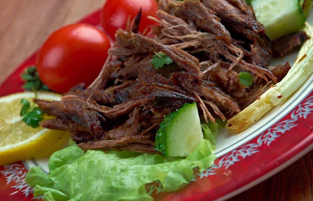 La birria es un plato a base de carne de borrego, preparado en salsa de muchas especias y chiles cocinados al horno. Suele servirse en caldo.