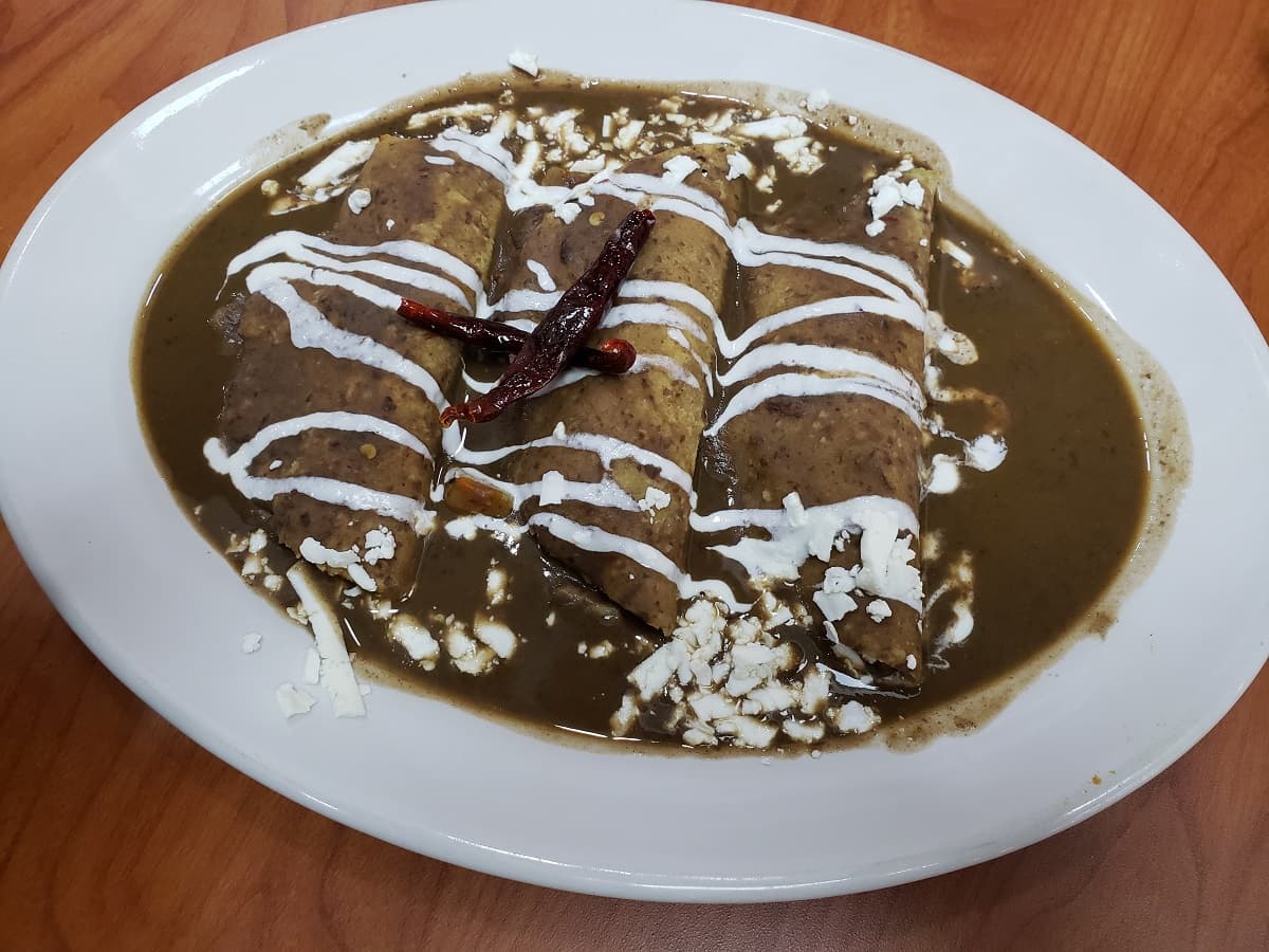 Este platillo es tradicional de la región de Yucatán. Es una preparación de la cultura mestiza,8 pero con grandes influencias indígenas. Son tortillas de maíz rellenas de huevo cocido y bañadas en salsa verde de pepitas de calabaza y salsa de tomate con chile habanero.