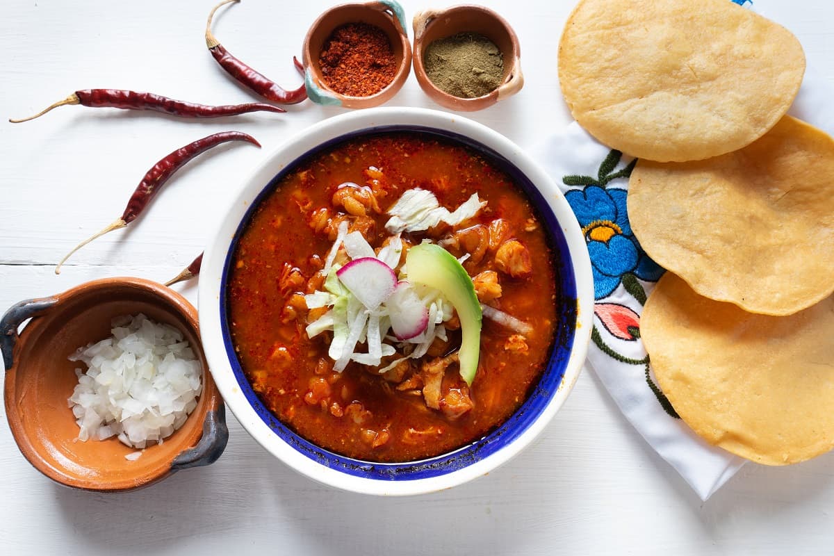 Aquí tenemos a otra gran estrella de la comida mexicana. Es un caldo hecho a base de granos de maíz conocido comúnmente como cacahuazintle. Se le agrega carne de pollo, res o cerdo, de acuerdo con la región.