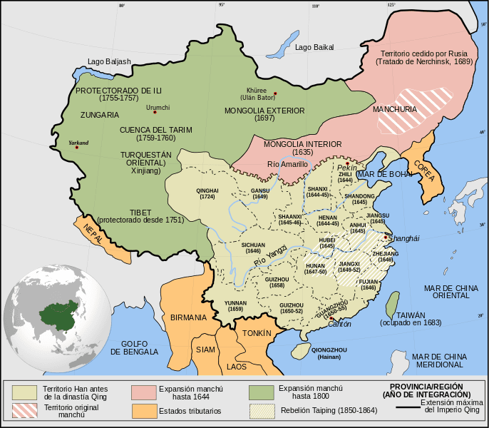 El quinto imperio más grande de la historia fue el imperio chino bajo la dinastía Qing. El imperio era una sucesión de territorios contiguos y ocupaba una superficie total de 14,7 millones de kilómetros cuadrados aproximadamente. Tenía una población de 381 millones, que representaba más del 36 % de la población mundial en 1820. La dinastía Qing fue la última dinastía de la China imperial y gobernó entre 1790 y el establecimiento de la República de China en 1912.
