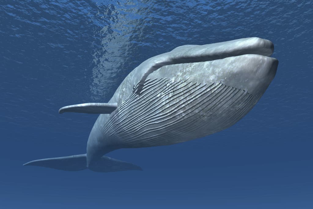 La ballena azul es uno de los animales más grandes del mundo, llegando a medir 30 metros y pesar 180 mil kilos. Se alimentan de unos crustáceos llamados krill, los cuales comen tomando el agua con su gran boca y separándolos de los desechos. A pesar de que no comen carne de otro tipo, sigue siendo el animal carnívoro más grande, y se encuentra en peligro de extinción.