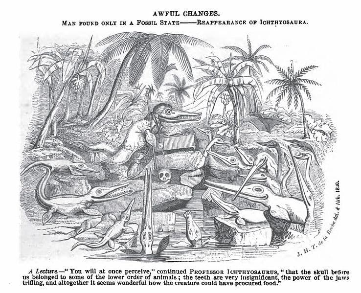 Las ideas de Lyell fueron caricaturizadas en una obra titulada Awful Changes, ambientada en un futuro en el que los dinosaurios conquistaban a los humanos y se burlaban de ellos por no tener capacidad biológicas de cazadores como las suyas.