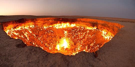 Al asomarnos mejor, comprobamos que ese espejismo dorado no es otra cosa que un gigante agujero destapado por los soviéticos en 1971 durante una inspección local en busca de pozos de gas. Tras prender fuego al interior del "pozo" comprobaron que no había gas, de modo que el infierno aún sigue activo más de 40 años después, intentando alcanzar la superficie.