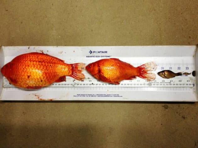 Como refleja la imagen en el post que encabeza este artículo, los ejemplares están alcanzado hasta 30 cm de longitud y un peso de 4 libras. Esto los convierte en verdaderos monstruos capaces de causar daños al ecosistema del río. Los científicos aseguran que la proliferación de estos goldfish gigantes en los ríos se debe a personas irresponsables que deciden liberar a sus mascotas de manera indiscriminada sin medir ni saber las consecuencias. Es natural que las especies aumenten de tamaño una vez que migran o se insertan en medioambientes más amplios, donde usualmente el alimento es más abundante. Esta regla biológica explica porqué la mayoría de las especies que viven en islas pequeñas son de poco tamaño.