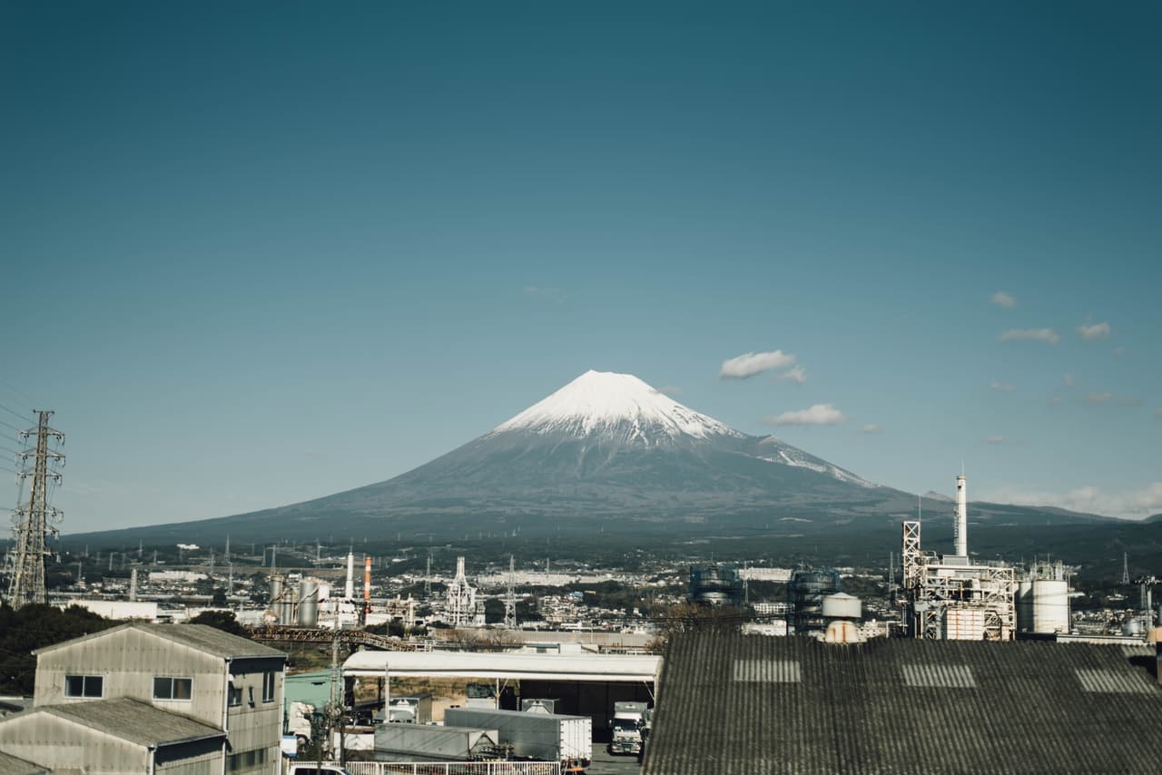 Aquí, desde otro punto de la ciudad, se observa el monte Fuji nevado desde los techos de casas y fábricas de zonas urbanas y las antenas que contrastan todavía de forma más impresionante con la naturaleza que se aprecia detrás.