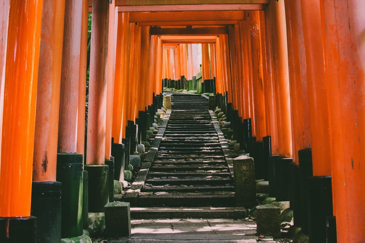 El santuario sintoísta Fushimi Inari-Taisha de Kioto se encuentra en la base de la montaña y hay varios senderos para ir a otros santuarios más pequeños a los que se accede por esta especie de túneles con una atractiva perspectiva.