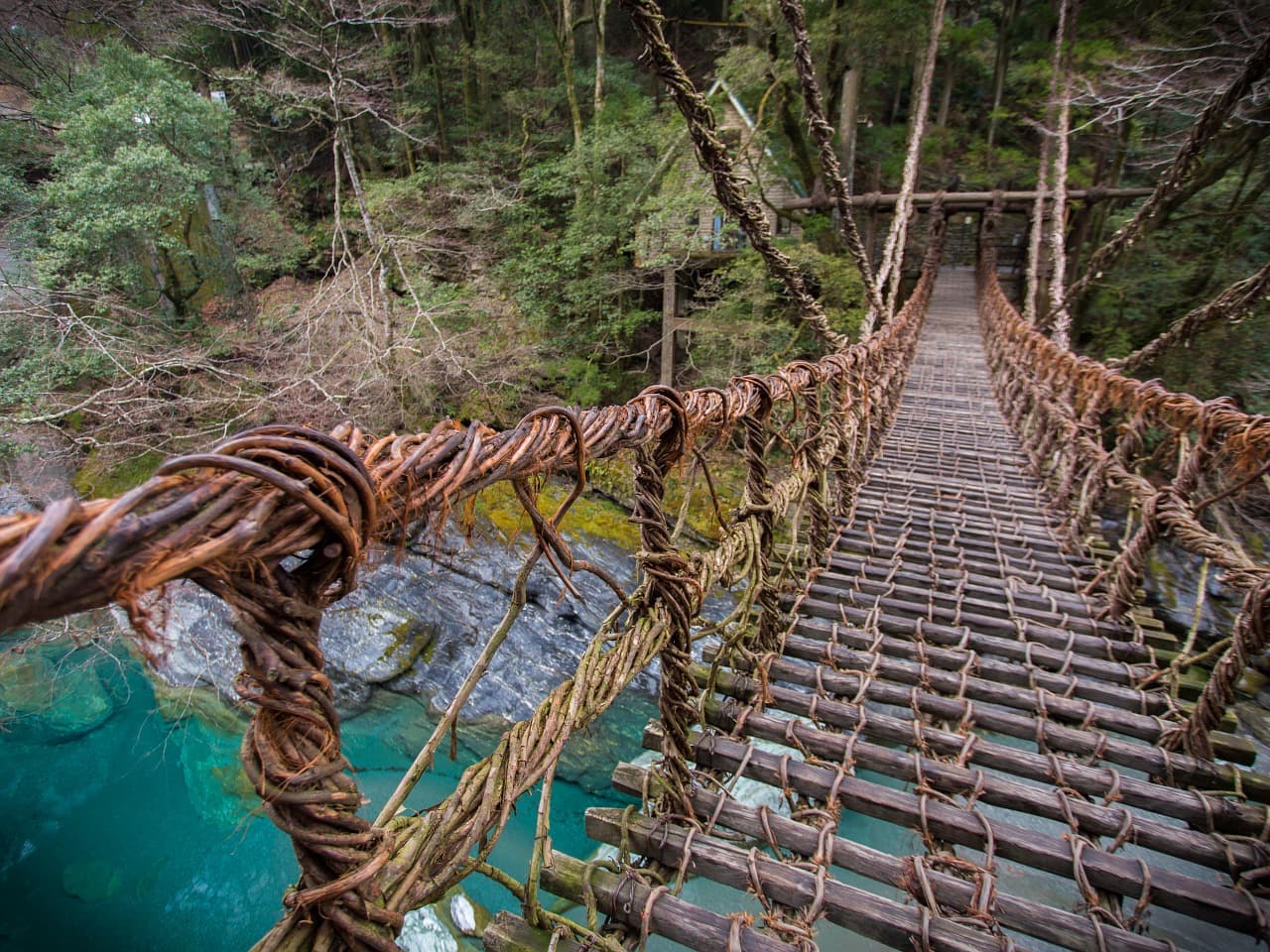 Y luego hay otro más llamativos como el puente colgante de Kazura que está hecho de madera y lleno de enredaderas, ubicado en la prefectura de Tokushima.