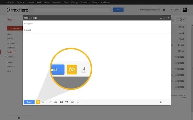 Cuando abras un correo o escribas uno nuevo, verás en la parte inferior un pequeño icono correspondiente a mxHero Toolbox, desde el que podrás acceder a sus funciones.