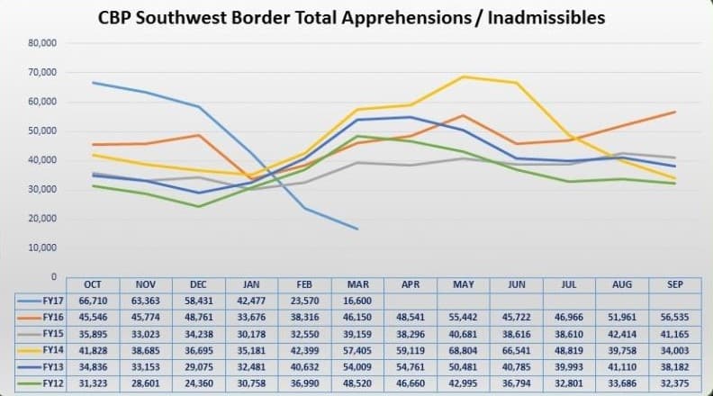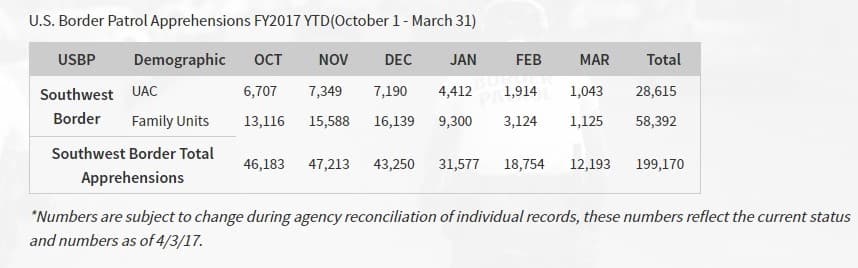 En enero, febrero y marzo la cantidad de familias detenidas en la frontera bajó considerablemente. En enero 2,737, febrero 1,053 y en marzo unos 764. Mientras que en los menores de edad no acompañados fue parecido: enero, 593, febrero 264 y en marzo unos 122. Según el sitio de la Oficina de Aduanas y Protección de Fronteras esta bajada se ha dado desde que el Presidente ha implementado las órdenes ejecutivas para cumplir con las leyes de inmigración. Los individuos: en enero se registraron 42,477 en febrero 23,570 y en marzo 16,600.