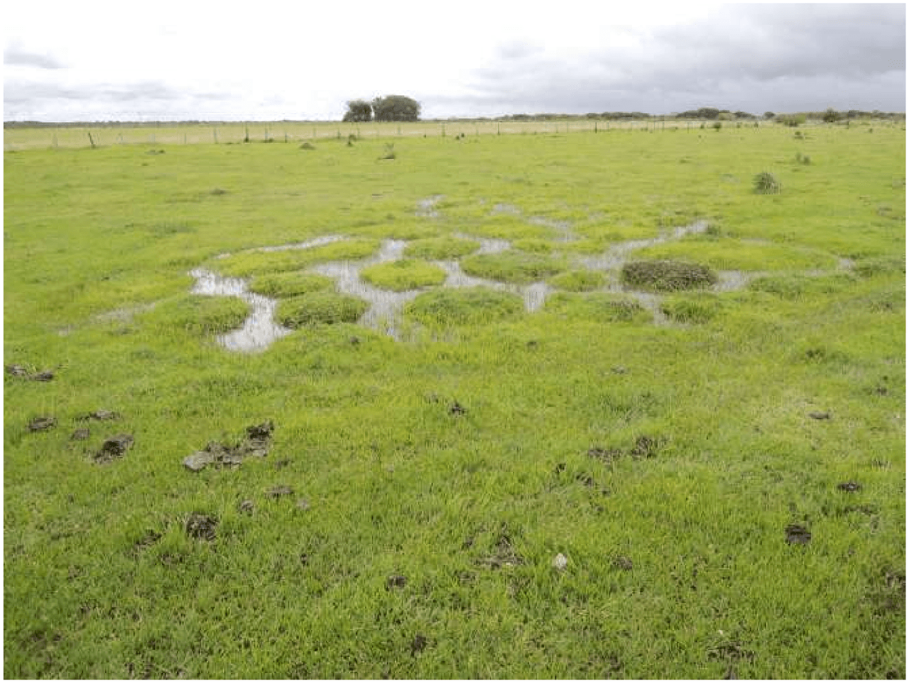 Durante la temporada de lluvias, es común observar un paisaje muy específico formado por montículos cubiertos de hierbas rodeados por agua, que alcanzan los 2 metros de alto y los 5 metros de diámetro.