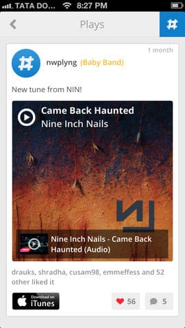 Otra cosa genial de nwplyng es el hecho de que puedes ver la música que los demás están escuchando. Así, hay una barra de explore en la que tienes la opción de buscar #hashtags o nombres de artistas. Al realizar esta búsqueda te entregará las canciones más populares de la banda de tu elección. Por ejemplo, al ingresar Daft Punk encontrarás rápidamente Get Lucky. También te muestra a los fans principales de la banda, de manera que podrías encontrar nueva gente a quien seguir a la que le gusta la misma música que a ti.