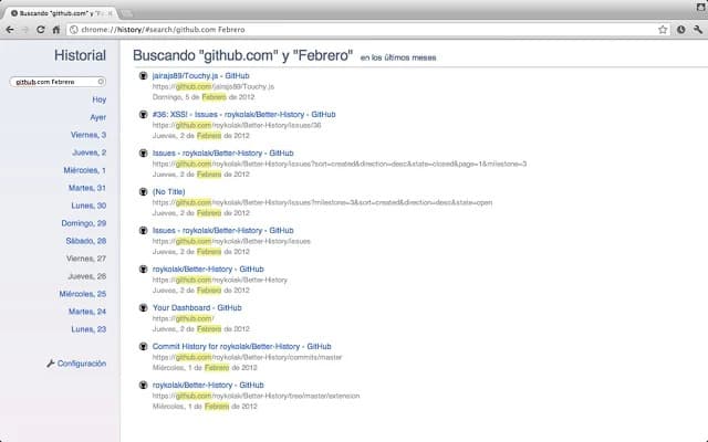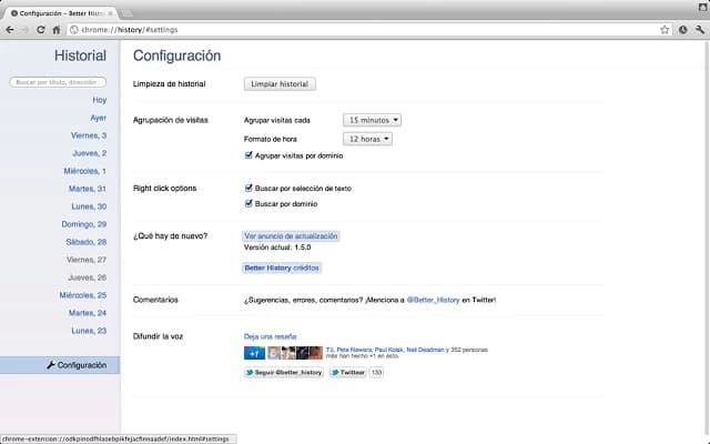Better History, viene organizado de manera cronológica por defecto, pero podemos configurarlo a nuestro gusto haciendo clic sobre el enlace configuración, al lado izquierdo de la pantalla.