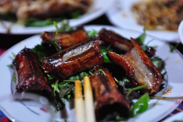 Plato de sangre. En el sudeste asiático no es raro encontrarse con cazuelas de sangre cruda de patos o cerdos. Se lo puede acompañar de vísceras cocidas.