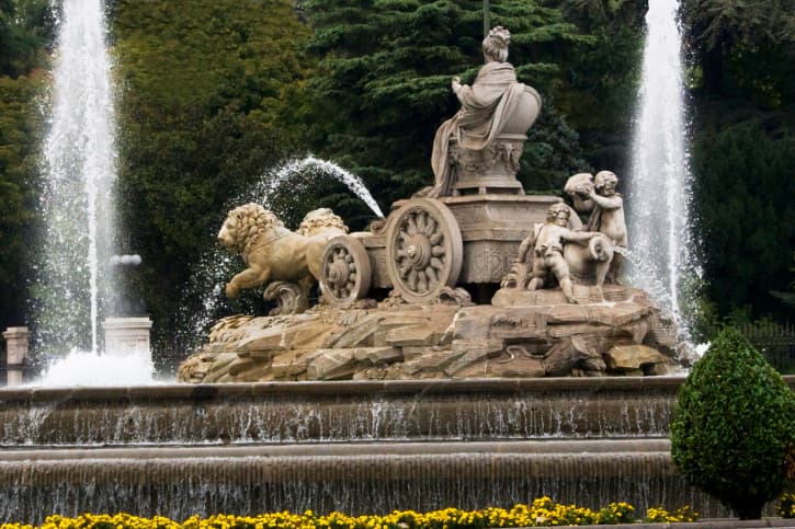 La monumental Plaza de Cibeles, y su fuente se ha convertido en un icono. Está en el centro de la ciudad de Madrid, y muestra a Cibeles, la Diosa griega de la fertilidad y la naturaleza sosteniendo un cetro y una llave mientras es llevada por dos leones y un carruaje. El carruaje simboliza el poder en la naturaleza que tiene esta Diosa.