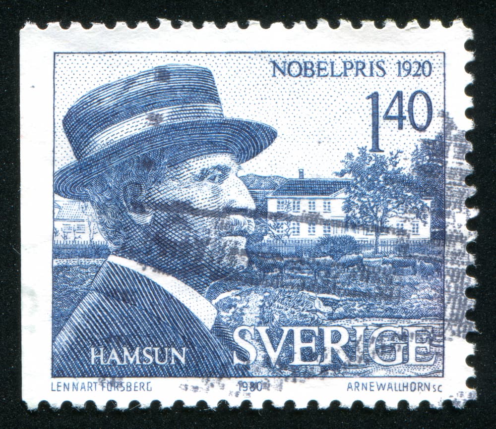 Estampilla sueca con un retrato de Knut Hamsun, circa 1980.