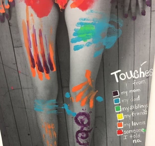 Su objetivo principal fue evidenciar las secuelas del acoso sexual a través de manchas de pintura en el cuerpo de una amiga. Las manchas evocan a las personas que han tocado su cuerpo a lo largo de su vida. Para interpretarlas, realizó una guía para identificar a qué persona pertenece cada mancha de color en el cuerpo. Están presentes sus padres, sus hermanos, sus parejas y en color rojo vivo, y apoderándose violentamente de las zonas íntimas de su cuerpo, las "personas que no conoce".