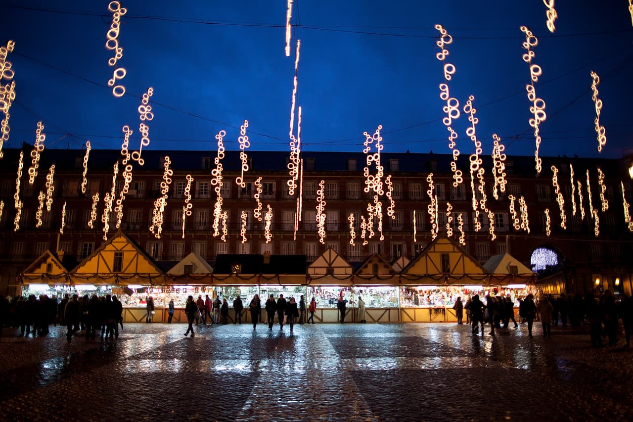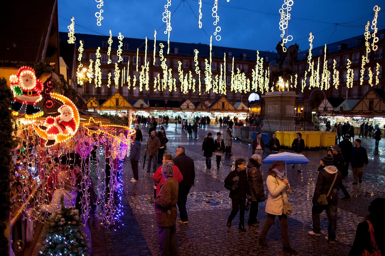 Ve de compras al mercado de la Plaza Mayor. El principal mercado de Navidad cada año en Madrid es en en este lugar. Normalmente se abre en la última semana de noviembre, con su inauguración oficial en la primera semana de diciembre.